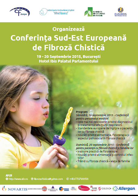 Asociația Europeană de Fibroză Chistică (Cystic Fibrosis Europe, http://www.cf-europe.eu/), Institutul de Ocrotire a Mamei și Copilului ”Alfred Rusescu” București (http://www.insmc.ro/) și Asociația de Fibroza Chistica din România (www.afcr.ro) organizează Conferința Sud-Est Europeană de Fibroză Chistică la București, Hotel Ibis Palatul Parlamentului, între 19-20 septembrie 2015.